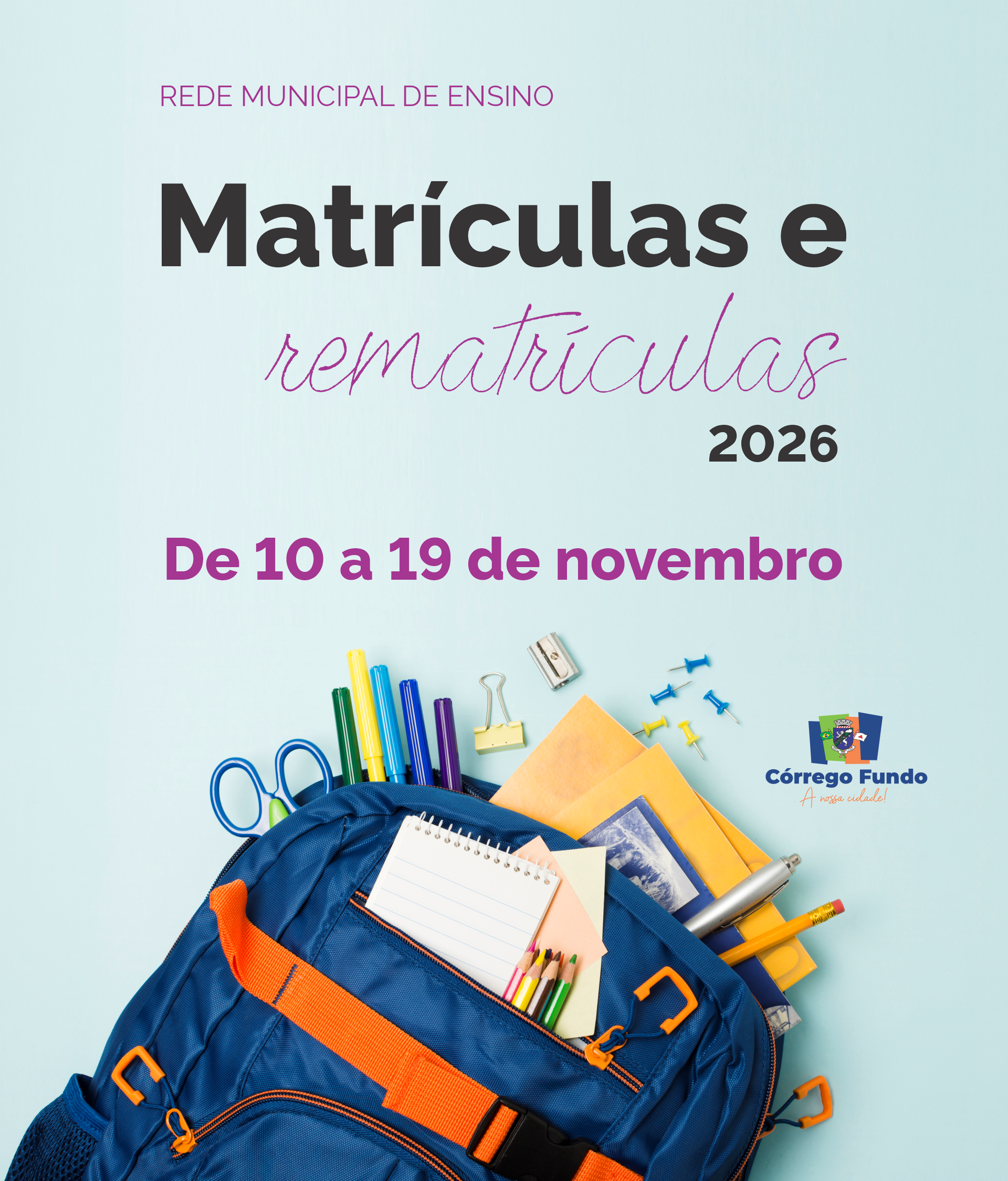 Pais e responsáveis que queiram matricular ou rematricular seus filhos nas escolas municipais (Escola Tereza Maria de Faria Vaz e Escola Rafael José Alves) e no CEMEI (Centro Municipal de Educação Infantil Sol Nascente) de Córrego Fundo, em 2026, devem ficar atentos aos prazos. O período para realização será de 10 a 19 de novembro. […]