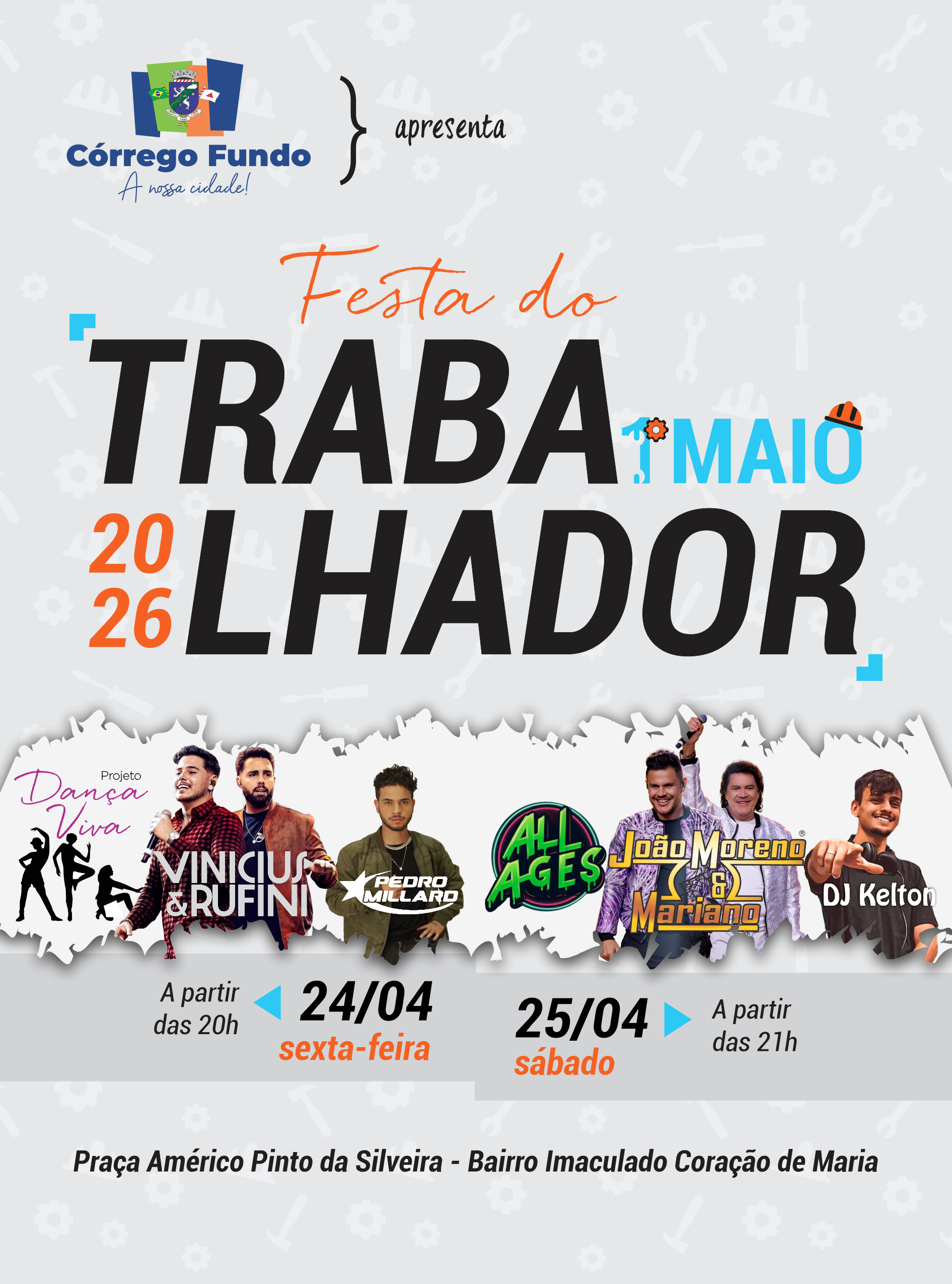 A Prefeitura de Córrego Fundo realizará, nos dias 24 e 25 de abril, a tradicional Festa do Trabalhador, com programação musical e cultural na Praça Américo Pinto da Silveira, no bairro Imaculado Coração de Maria. A celebração homenageia a força e a dedicação da classe trabalhadora do município. Na sexta-feira (24/04), a partir das 20h, […]