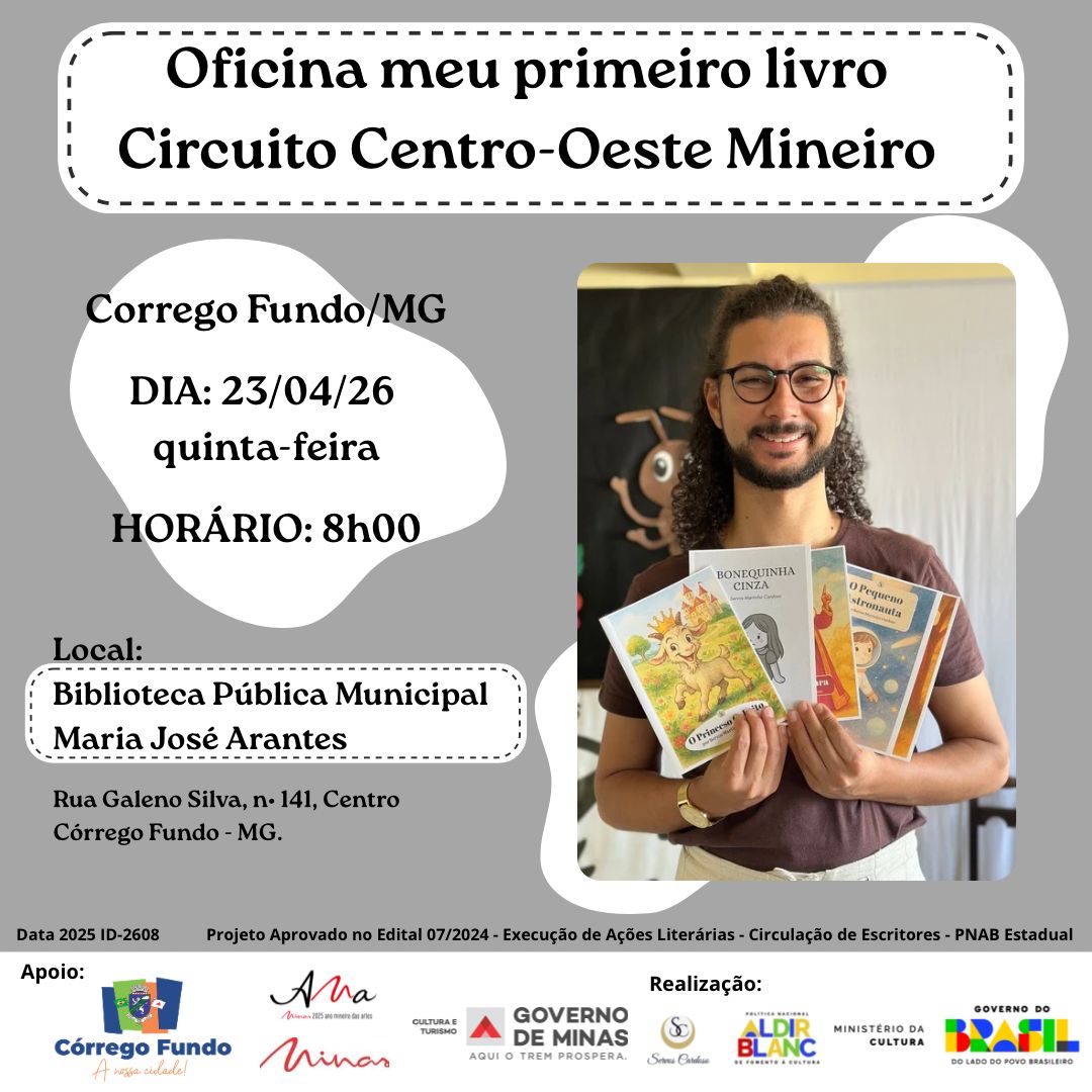A Biblioteca Pública Municipal Maria José Arantes, localizada no Centro de Córrego Fundo (MG), receberá a oficina “Meu Primeiro Livro” – Circuito Centro-Oeste Mineiro, no dia 23 de abril (quinta-feira) às 8h. A atividade será ministrada pelo escritor Servos Cardoso para adolescentes de 12 a 17 anos e adultos a partir de 18 anos, com […]