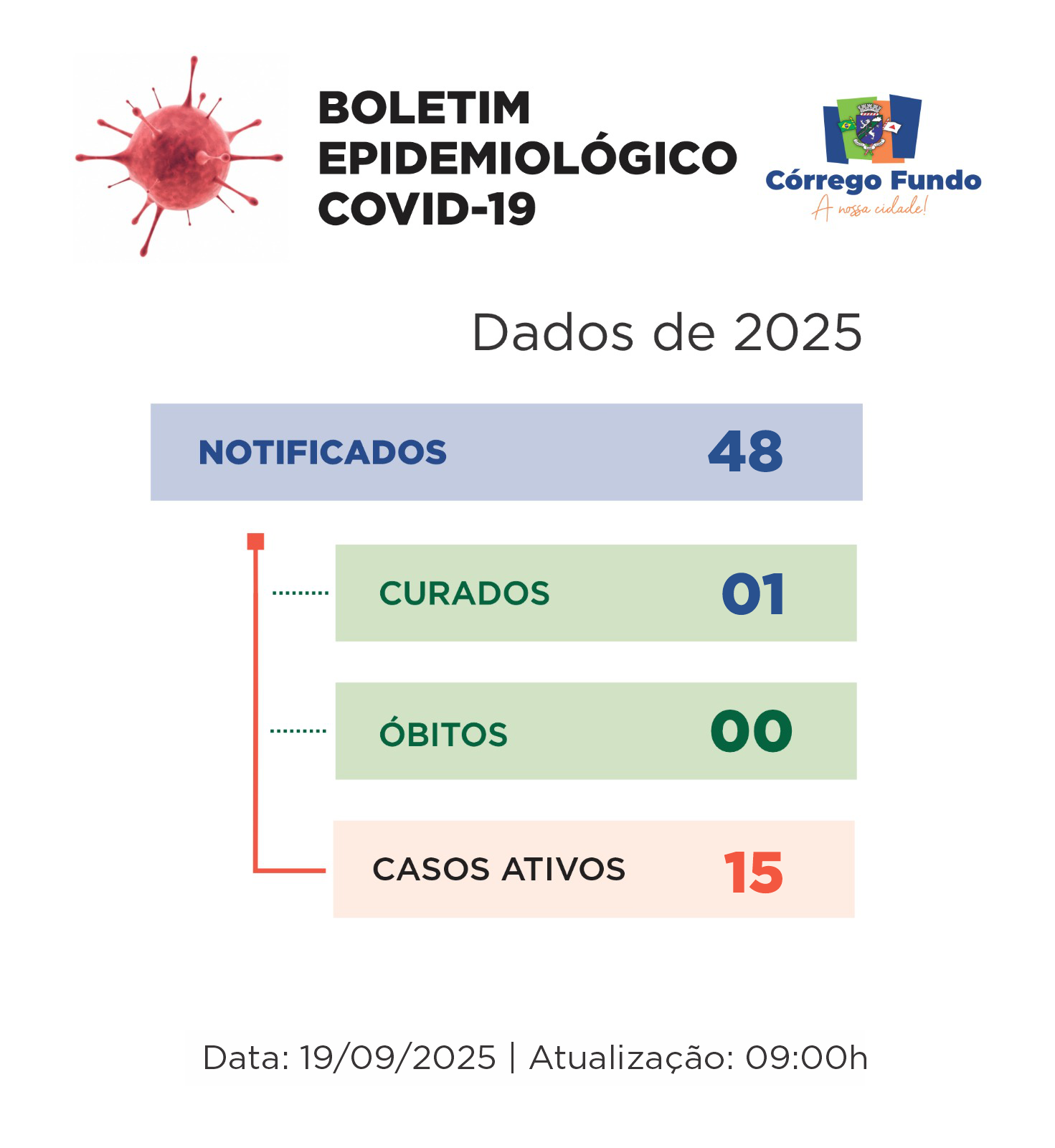 Atenção para o Boletim de Covid-19 em Córrego Fundo, atualizado hoje, 19/09/2025.