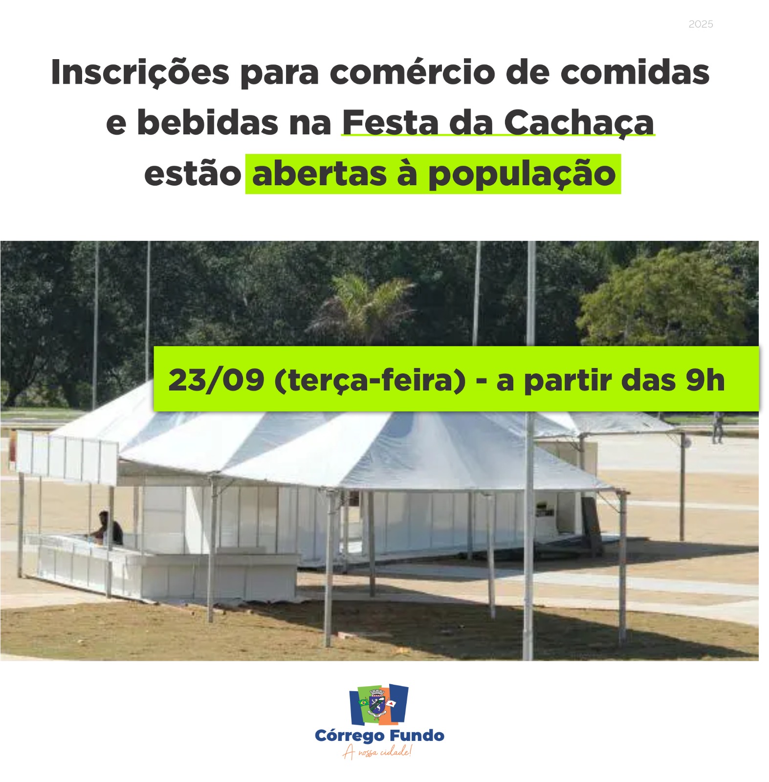 A Prefeitura de Córrego Fundo, por meio da Secretaria de Cultura, Esporte e Lazer, disponibilizará 3 vagas para barracas do comércio local na 2ª Festa da Cachaça município. Os interessados podem se inscrever a partir de hoje, às 9h, na sede da secretaria, garantindo sua participação no evento. Os inscritos não poderão comercializar bebida alcóolica.