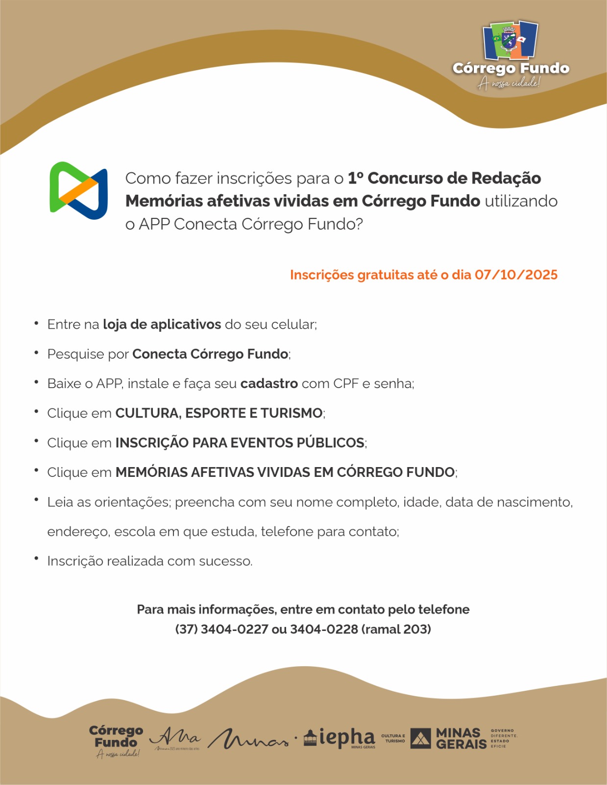 O concurso é destinado a estudantes de 12 a 17 anos. As inscrições começaram em 29 de setembro de 2025 e vão até 7 de outubro. Elas devem ser feitas presencialmente na sede da Secretaria ou pelo aplicativo Conecta Córrego Fundo.