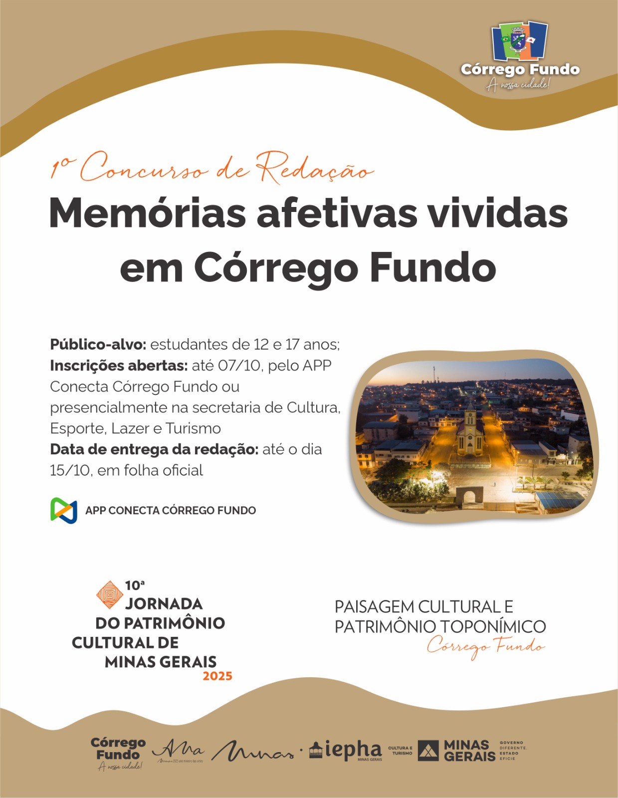 A Prefeitura Municipal de Córrego Fundo, por meio da Secretaria de Cultura, Esporte, Lazer e Turismo, abriu inscrições para o 1º Concurso de Redações. O tema é “Memórias Afetivas Vividas em Córrego Fundo”.
