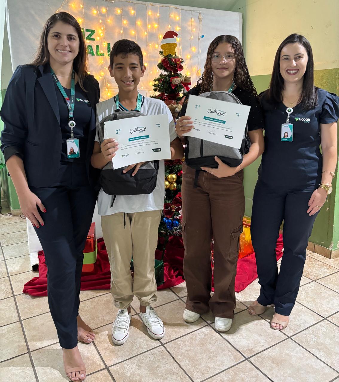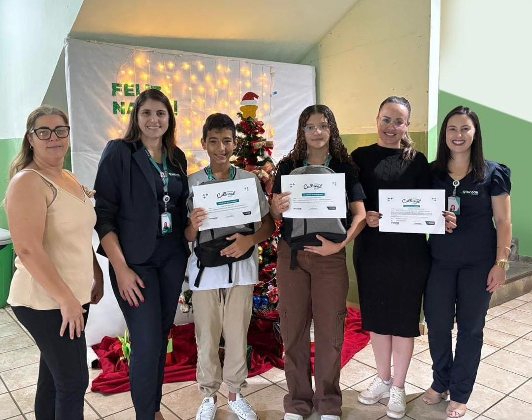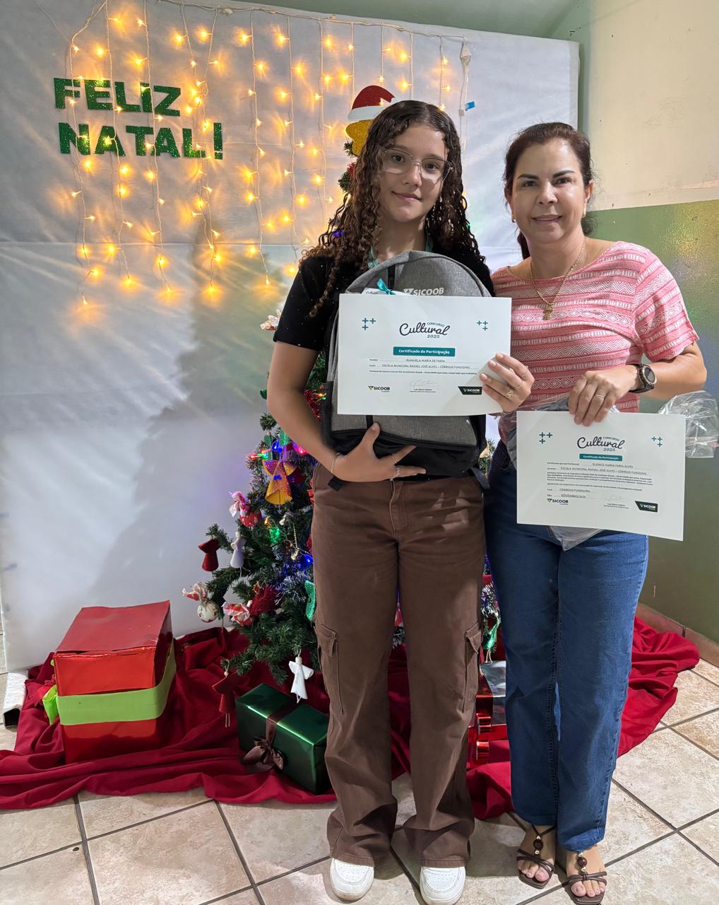 Os alunos Bernardo Faria Costa, do 7º ano I, e Manuela Maria de Faria, do 9º ano I, da Escola Municipal Rafael José Alves, receberam a premiação do Concurso Cultural do Sicoob Credifor no dia 2 de dezembro de 2025.
