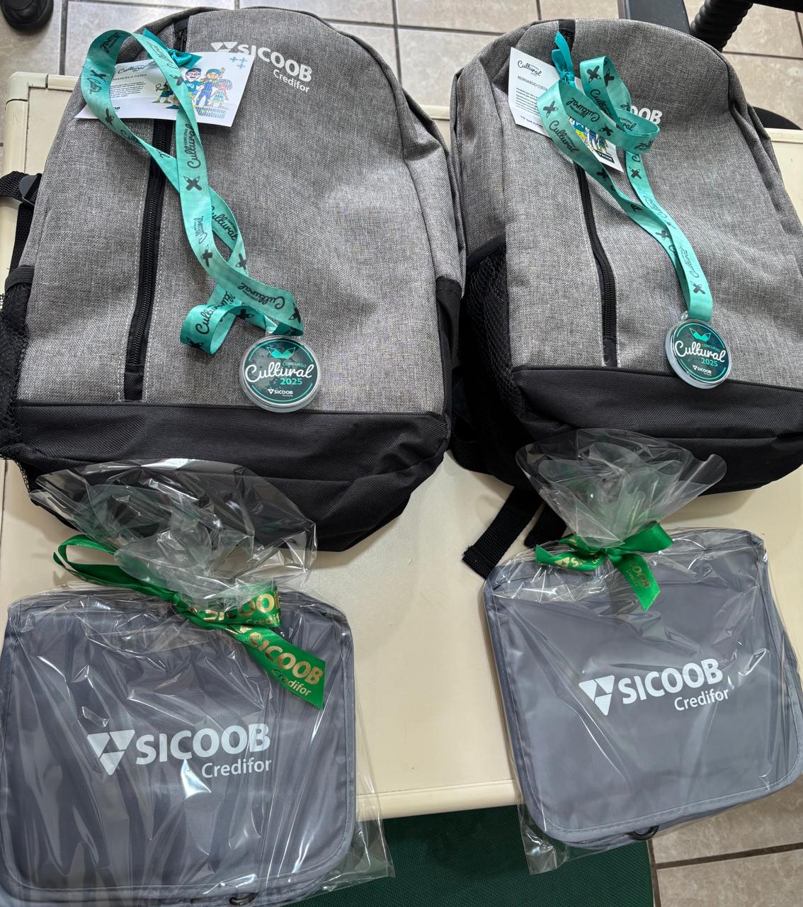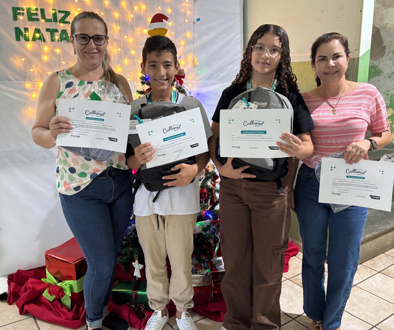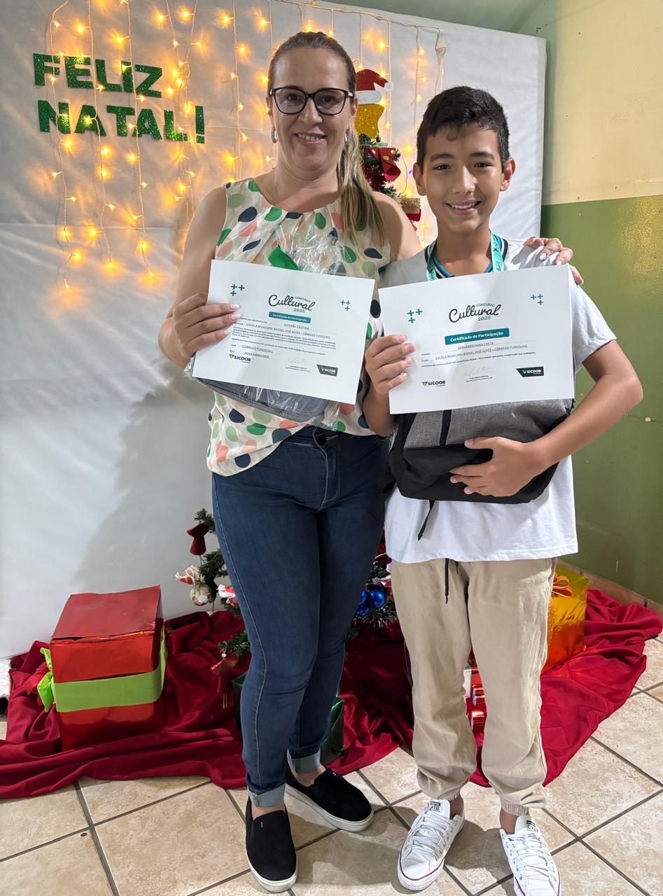 Os alunos Bernardo Faria Costa, do 7º ano I, e Manuela Maria de Faria, do 9º ano I, da Escola Municipal Rafael José Alves, receberam a premiação do Concurso Cultural do Sicoob Credifor no dia 2 de dezembro de 2025.