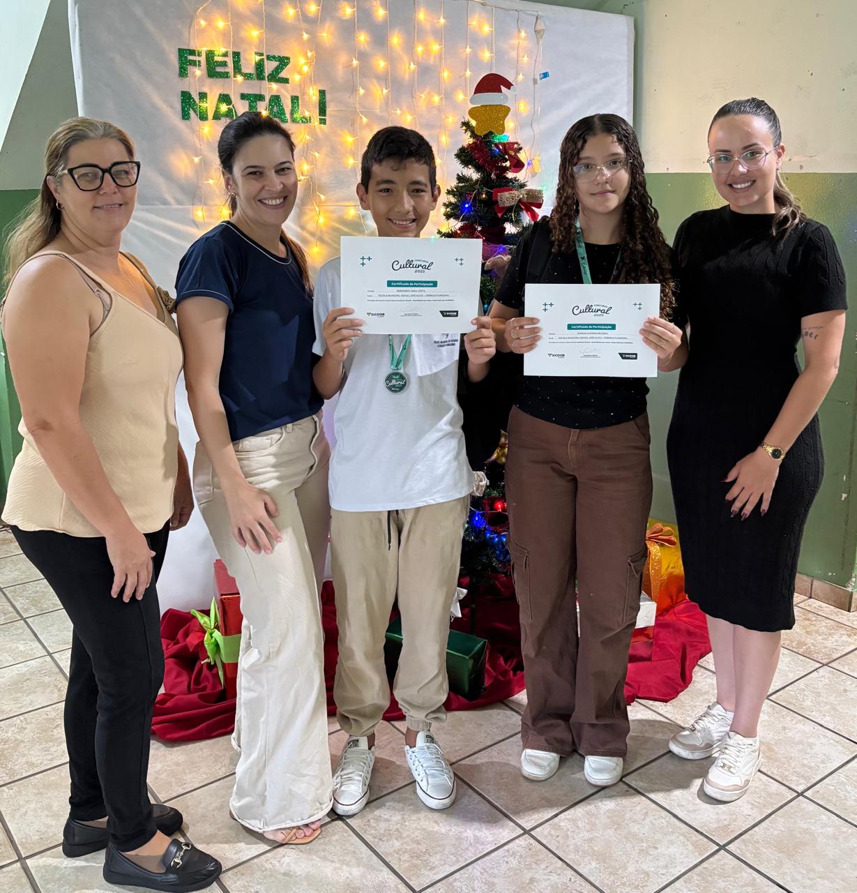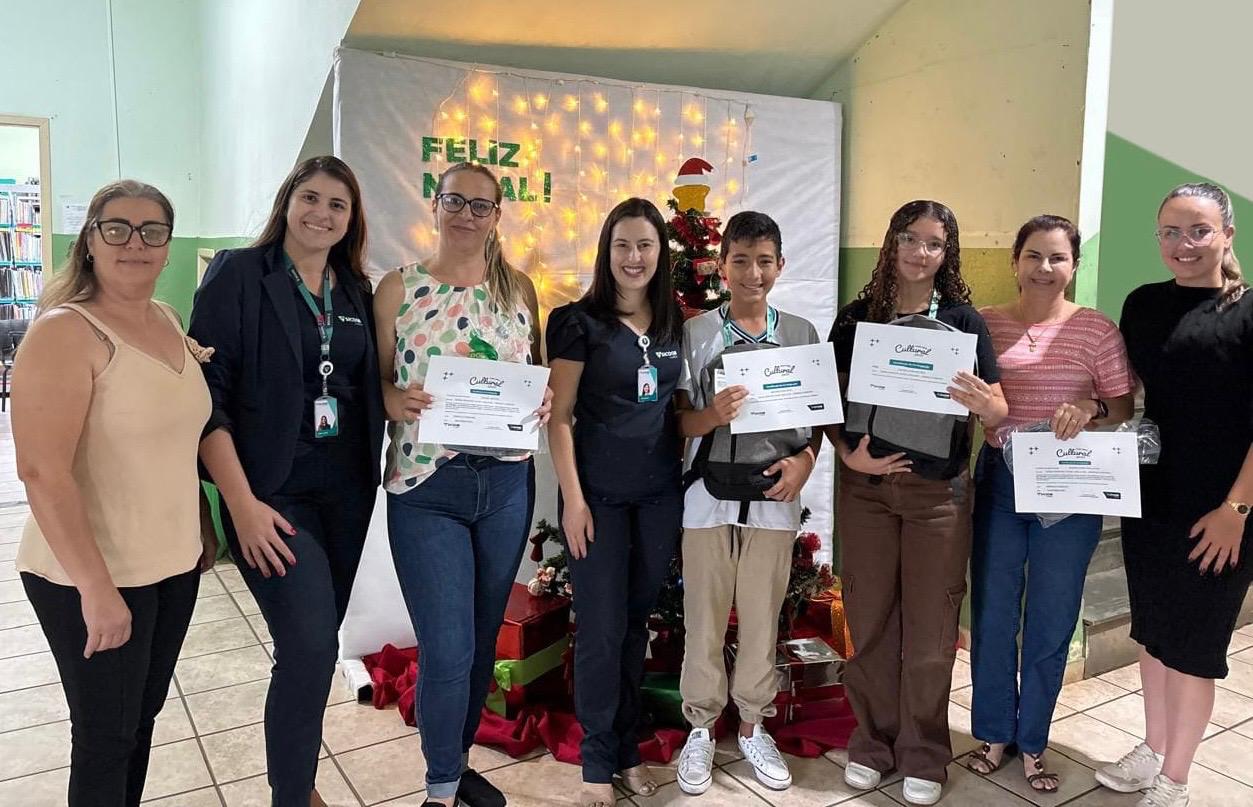 O momento de premiação contou com a presença da diretora Eduarda Leão, da vice-diretora Aline Alves, da coordenadora Aline Silva e das professoras de português Elenice Alves e Jussara Silva, que acompanharam a produção textual dos alunos.